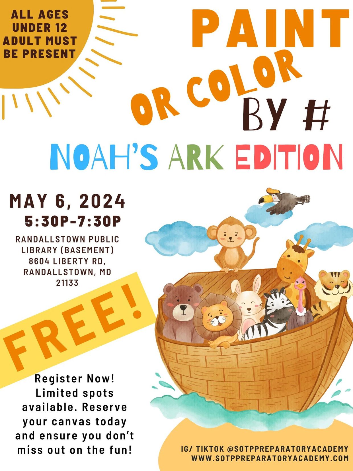 Join us at the Randallstown Library for a delightful and free "Paint/Color By Number: Noah's Ark Edition" workshop! Open to participants of all ages, this event perfectly combines the educational elements of The School of the Prophets Preparatory Academy RSMA curriculum (Reading, Mathematics, Science, and Art) with a focus on art and mathematics. Monday, May 6, 2024 from 5:30p-7:30p, our workshop offers a unique opportunity for both beginners and experienced artists to enjoy a relaxing day of painting. Guided by our color-by-number format, participants will engage in an activity that enhances their mathematical skills while exploring artistic expression through vibrant scenes inspired by the timeless tale of Noah's Ark. All necessary materials are provided, enabling you to unleash your creativity and take home your very own masterpiece. This workshop is not only an excellent way to unwind and learn new skills but also a fantastic chance to connect with fellow community members in a supportive environment. Spaces are limited, so please register in advance