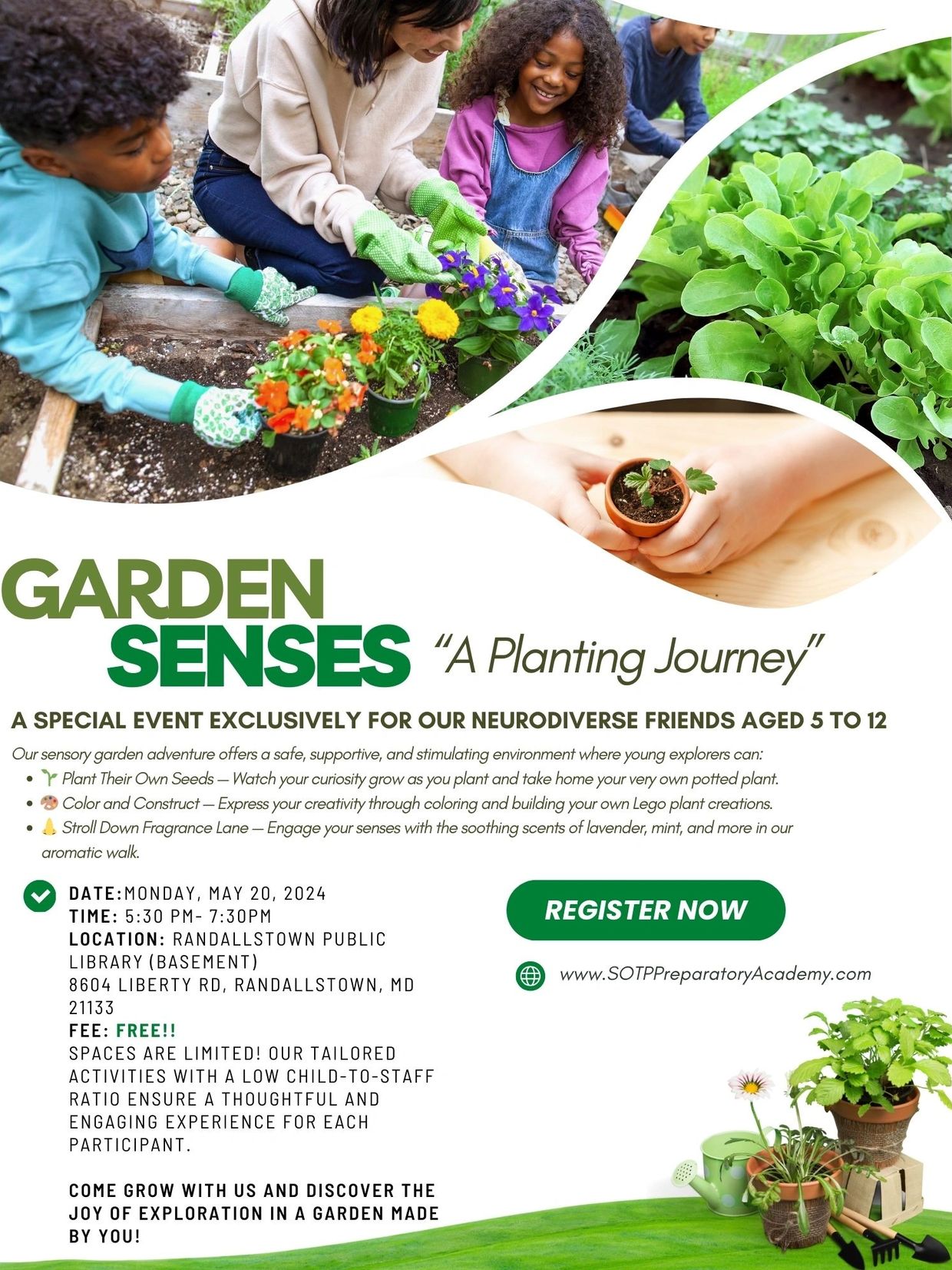 Join us at the Randallstown Library for a delightful and free "Garden Senses: A Planting Journey" workshop! This event perfectly combines the educational elements of The School of the Prophets Preparatory Academy RSMA curriculum (Reading, Mathematics, Science, and Art) with a focus on art and science. Monday, May 20, 2024 from 5:30p-7:30p, this unique sensory adventure is designed exclusively for neurodiverse children aged 5 to 12. "Garden of Senses: A Planting Journey" offers an enriching day of discovery in a supportive, engaging, and safe environment tailored specifically to the needs of our young explorers. Spaces are limited, so please register in advance.